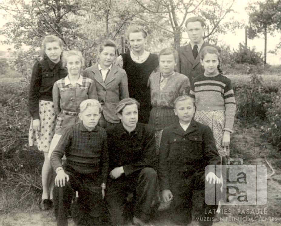 Pamatskolas 7. klases jaunieši vairākās rindās Frīdrihsortas nometnē Ķīlē (angļu zonā). Priekšā trīs puiši notupušies uz viena ceļa, aizmugurē stāv jaunietes un klases audzinātājs. Fonā uz nelielas nogāzes aug koki. Priekšā, no kreisās: Vilhelms Adlers, Ivars Līcis un Donāts Indāns. Aizmugurē stāv, no kreisās: Gita Nodieva, Lilija Kārkliņa, Lija Lazdiņa, Pegija Skrastiņa (pr. Klausa), Lilija Rušmane, Jāzeps Viļums (klases audzinātājs) un Skaidrīte Petrovica.