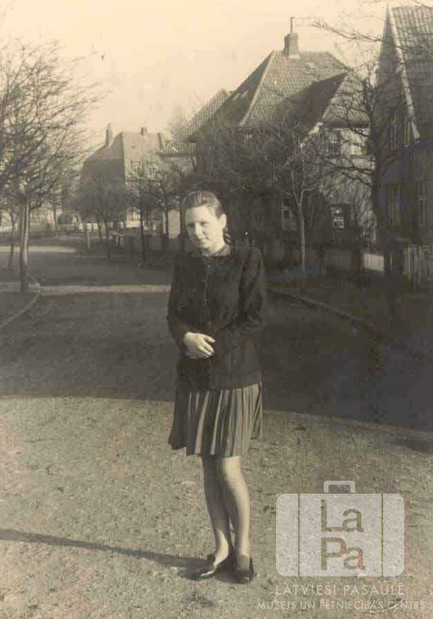 Pegija Skrastiņa (pr. Klausa) no Frīdrihsortas nometnes Ķīlē (angļu zonā) pastaigas laikā pa šauru ielu Ķīlē 1947. gada rudenī. Gar ielas malām ir koku rindas un divstāvu ēku rinda.