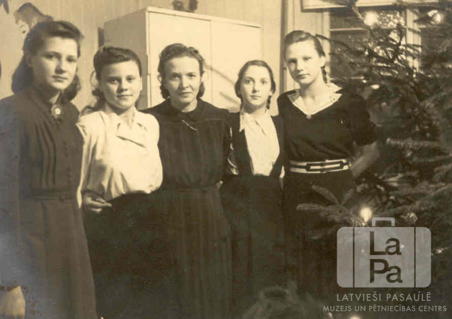 Piecas pamatskolas skolnieces ar klases audzinātāju skolas telpā pie Ziemassvētku egles Frīdrihsortas nometnē Ķīlē (angļu zonā). Priekšplānā, labajā pusē, eglē ir aizdegtas sveces. Fonā ir skapis un logs. No kreisās: Lija Lazdiņa, Lilija Rušmane, L. Korpa (klases audzinātāja), Skaidrīte Petrovica un Pegija Skrastiņa (pr. Klausa).