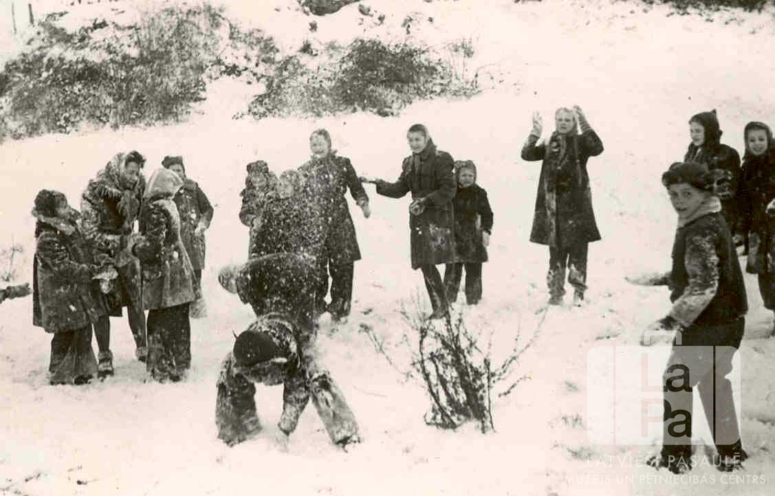 Pamatskolas skolēni izbauda ziemas priekus stundu starpbrīžos Frīdrihsortas nometnē Ķīlē (angļu zonā). Bērni sniega klātos mēteļos, cepurēs, lakatos un smaidošām sejām stāv sniegā. Fonā ir zemiem krūmiem apaugusi nogāze.
