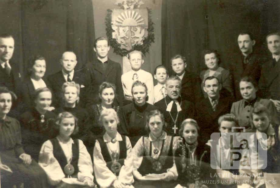 Pamatskolas absolventi ar skolotājiem un nometnes vadību Frīdrihsortas nometnē Ķīlē (angļu zonā). Grupā ir redzams arī mācītājs amata tērpā un vairākas jaunietes tautastērpos. Fonā pie sienas ir Latvijas mazais papildinātais ģerbonis. Pirmajā rindā sēž, no kreisās: Lilija Rušmane, Lilija Kārkliņa, Lija Lazdiņa, Skaidrīte Petrovica, Pegija Skrastiņa (pr. Klausa) un Gita Nodieva. Otrajā rindā, no kreisās: V. Saltupe, E. Vilka, ? Veidenberga (ģimnāzijas direktore), Alīde Petrovica, Līvija Karpa, ? Gabliks (mācītājs), nezināms un M. Prauliņa. Trešajā rindā, no kreisās: nezināms, nezināms, ? Meļķis (ārsts), Ivars Līcis, Vilhelms Adlers, Raimonds Liepiņš, Donāts Indāns, Z. Rudzroga, ? Meiers (nometnes priekšnieks) un Leons Vīksne.