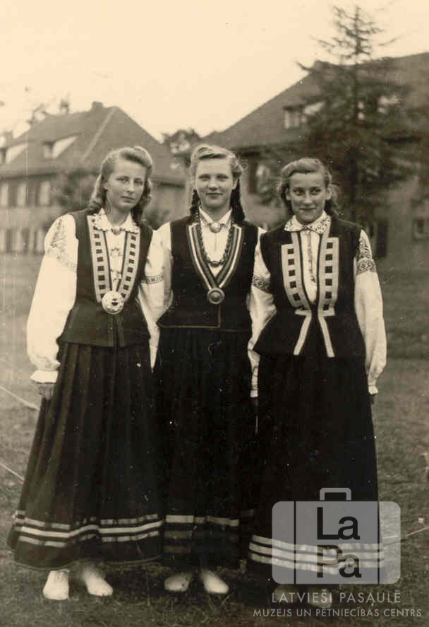 Trīs jaunietes tautastērpos pirms ģimnāzijas kora koncerta Neištatē (Holšteinā, angļu zonā). Fonā ir divstāvu mūra ēkas. No kreisās: Ina Jansone, Pegija Skrastiņa (pr. Klausa) un Ruta Sidraba.