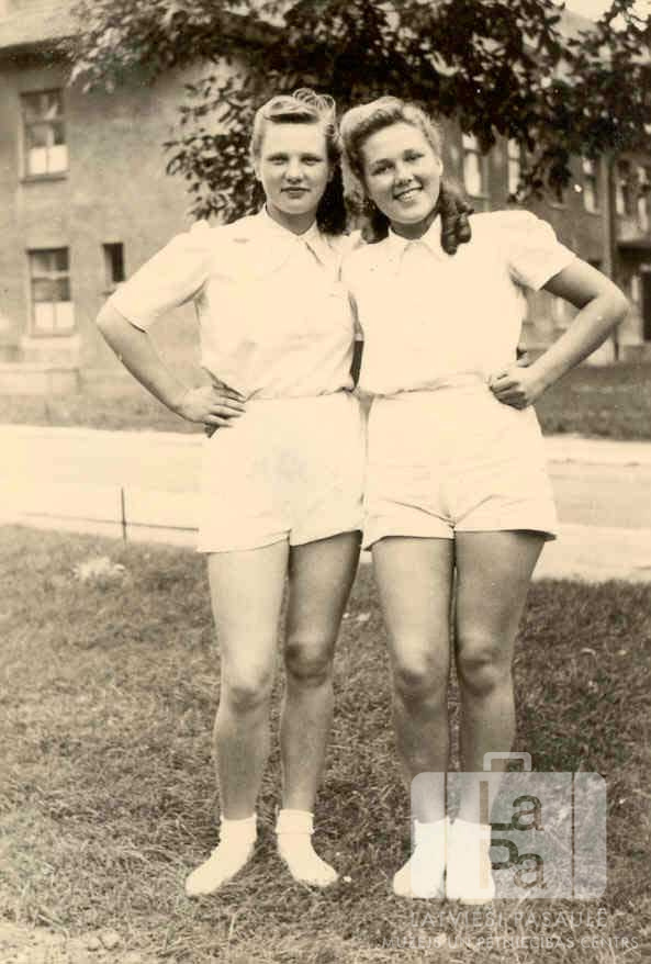 Divas sportistes pirms sporta svētkiem Neištates nometnē (Holšteinā, angļu zonā). Abas jaunietes ir ģērbušās gaišos sporta tērpos. Fonā ir divstāvu mūra ēka. No kreisās: Pegija Skrastiņa (pr. Klausa) un Biruta Vinca.