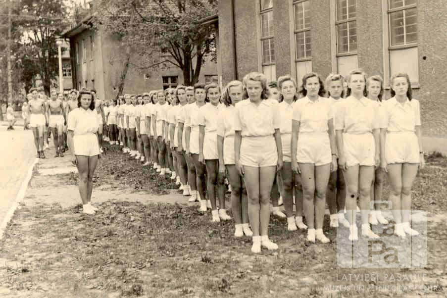 Sportisti un sportistes ceļā uz sporta svētkiem Neištates nometnē (Holšteinā, angļu zonā). Jaunieši ierindā ir ģērbušies sporta tērpos. Priekšā, labajā pusē, četrās rindās viena aiz otras stāv sportistes. Kreisajā pusē stāv sieviete gaišā sporta tērpā; puiši stāv aiz viņas. Fonā, labajā pusē, ir vairākas divstāvu mūra ēkas.