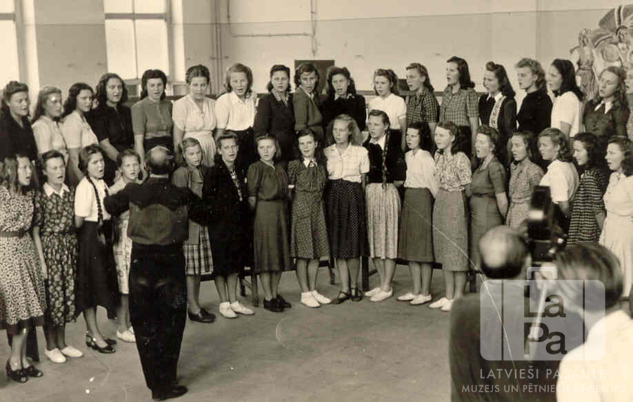 Latviešu ģimnāzijas meiteņu kora mēģinājums iekštelpās Neištates nometnē (Holšteinā, angļu zonā). Jaunietes dzied divās rindās puslokā. Priekšā, kreisajā pusē, stāv diriģents; labajā pusē divi vīrieši, viens no kuriem tur videokameru. Fonā, kreisajā pusē, ir divi ēkas logi. Priekšā, kreisajā pusē: Roberts Zuika (diriģents). Kora pirmajā rindā stāv, no kreisās: pirmā Tamāra Elstiņa, otrā Velta Butnere, trešā Miriama Ozolniece, sestā Biruta Mikus, devītā Laila Tūtere, desmitā Pegija Skrastiņa (pr. Klausa), divpadsmitā Mirdza Jaunzeme, trīspadsmitā Gaida Runge, četrpadsmitā Biruta Skanis. Otrajā rindā, no kreisās: Dzidra Lazdiņa, Gertrūde Lediņa, Ilze Rozenberga, Anita Rituma, Skaidrīte Klezberga, Agita Abena, Aina Poriete, nezināms, Ruta Sidraba, nezināms, Zigrīda Dancis, Gaisma Kovala, Māra Dickale, Lauma Sileniece, Ārija Runģe, Vīta Skulte un Līvija Lielbārde.