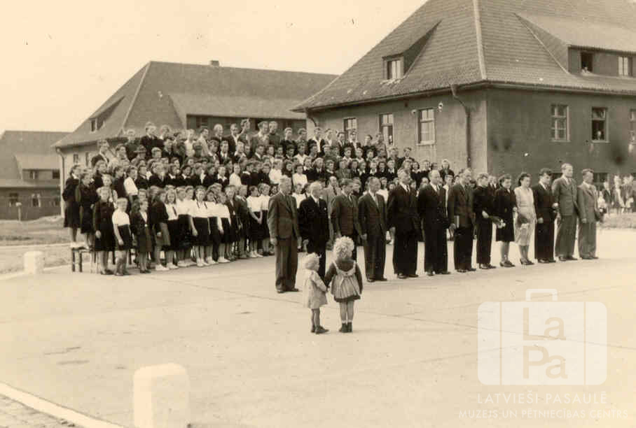 Apvienotās latviešu ģimnāzijas koris, diriģents, skolotāji un nometnes vadība gaida viesi Neištates nometnē (Holšteinā, angļu zonā). Iespējams, ka viesis bija Latvijas Republikas sūtnis Lielbritānijā Kārlis Zariņš. Priekšā stāv divi mazi bērni pie cilvēku ierindas; aizmugurē stāv koris vairākās rindās. Fonā ir vairākas divstāvu dzīvojamās ēkas.