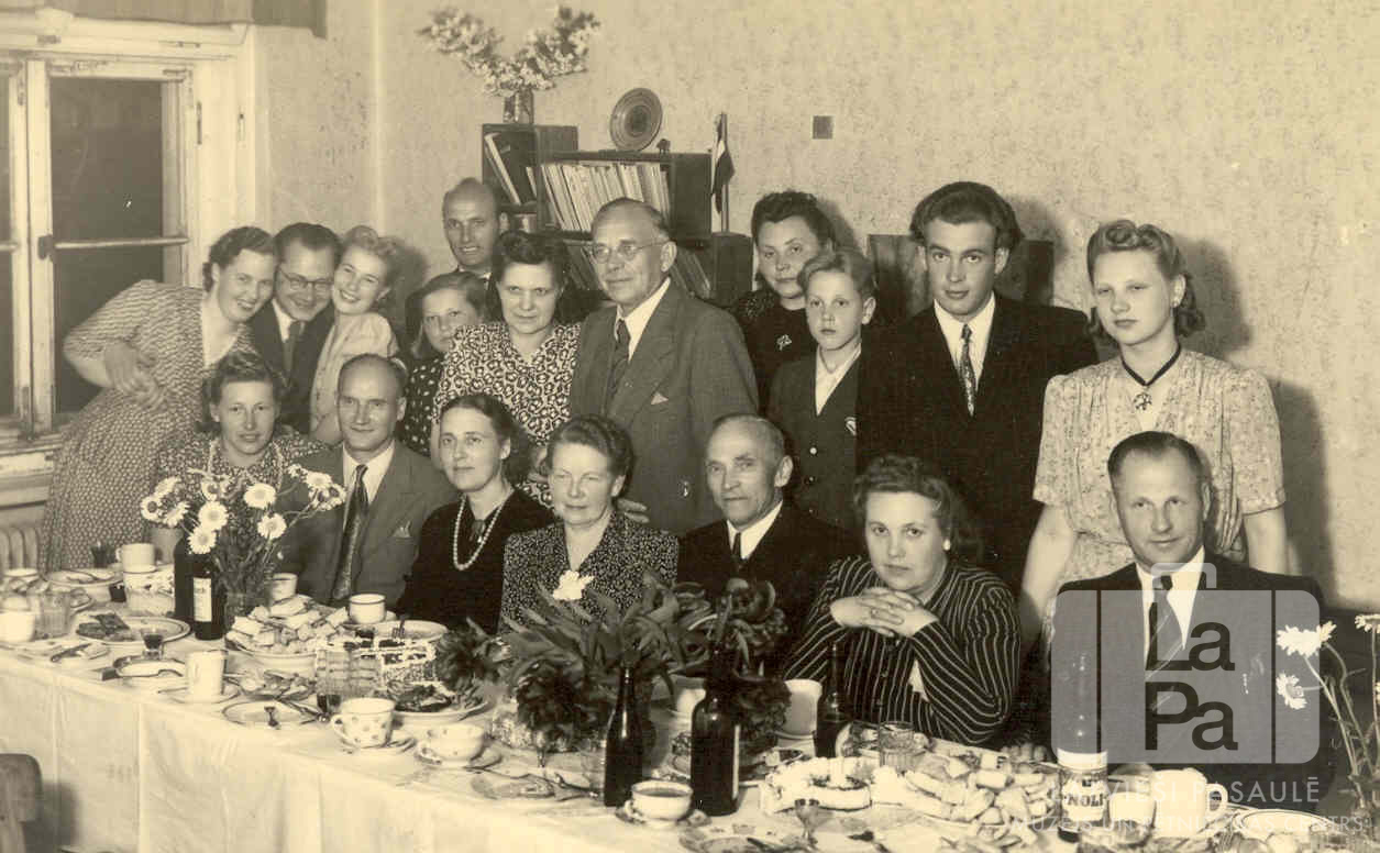 Kristību svinības Neištatē (Holšteinā, angļu zonā) 1950. gada pavasarī. Cilvēki divās rindās pie galda; pirmā rinda sēž sēž. Uz galda ir trauki ar ēdienu, dzērienu pudeles un ziedi vāzēs. Kreisajā pusē galda galā ir telpas logs; fonā, aiz cilvēkiem pie sienas ir plaukti ar dokumentiem. Pirmajā rindā sēž, no labās: Arnolds Skrastiņš un Valija Skrastiņa. Otrajā rindā stāv, no labās: pirmā Pegija Skrastiņa (pr. Klausa), otrais Osvalds Ozolnieks un trešais Juris Skrastiņš. Par šo gadījumu Pegija Klausa (dz. Skrastiņa) stāsta: "Pulcējāmies pie pilniem galdiem, lai svinētu mazuļa kristības."