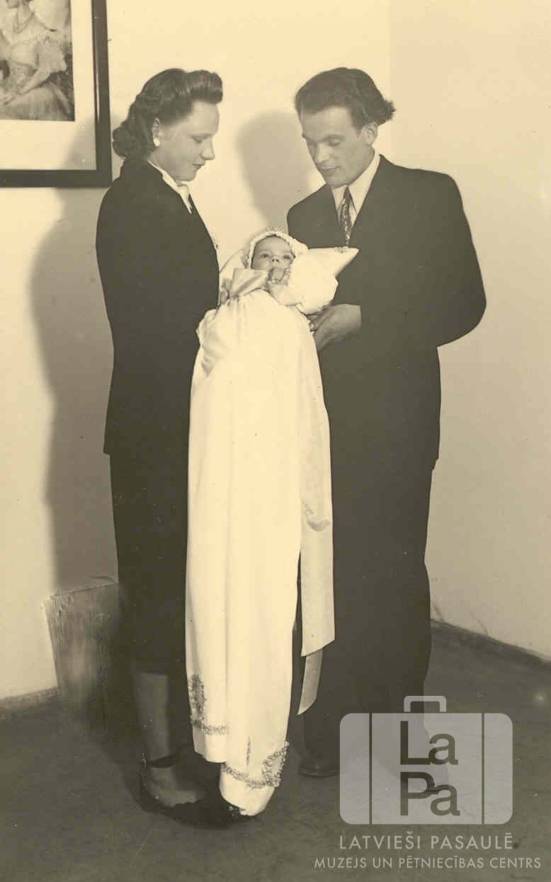 Krustvecāki ar krustbērnu Neištatē (Holšteinā, angļu zonā) 1950. gada pavasarī. Divi jaunieši ar zīdaini. Fonā pie sienas ir glezna. No kreisās: Pegija Skrastiņa (pr. Klausa), nezināms (bērns) un Osvalds Ozolnieks.