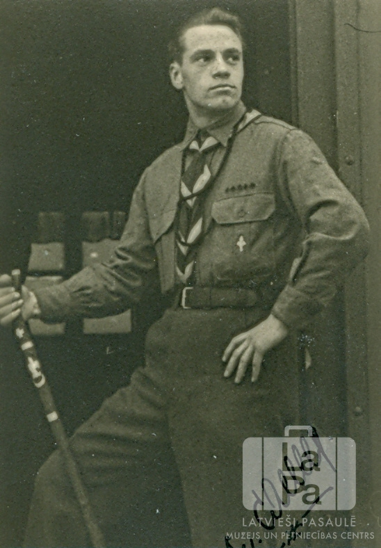 Skautu vadītājs Maigonis Caune formastērpā un ar nūju Flensburgā (angļu zonā). Fotogrāfijas apakšējā labajā stūrī ir ar roku rakstīts paraksts.