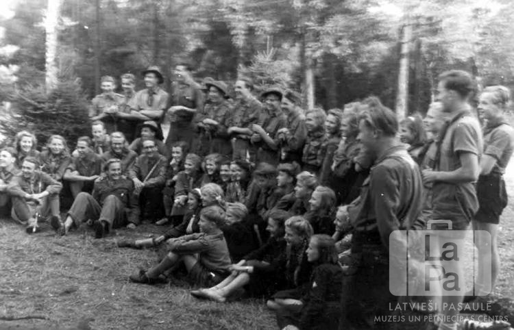 Liela grupa ar jauniešiem un pieaugušajiem ugunskura vakarā gaidu un skautu nometnē, kurā piedalījās gan dalībnieki no Augustdorfas nometnes (angļu zonā), gan arī Grēvenes nometnes. Cilvēki formastērpos stāv vairākās rindās, priekšā jaunieši sēž uz zemes. Fonā mežs.