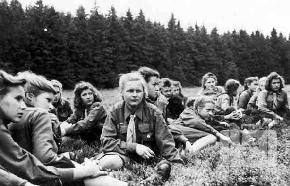 Gaidas formastērpos sēž pļavā gaidu un skautu nometnē, kurā piedalījās gan dalībnieki no Augustdorfas nometnes (angļu zonā), gan arī Grēvenes nometnes. Fonā aiz pļavas ir egļu mežs.
