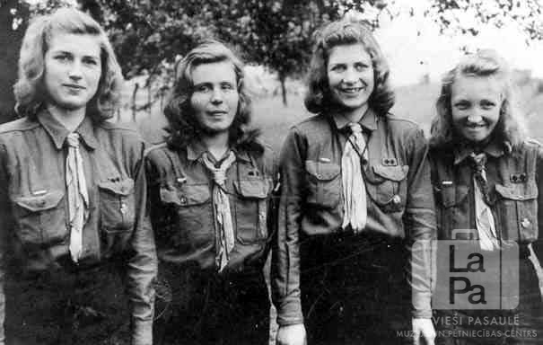 Četras gaidas no Augustdorfas nometnes (angļu zonā). Jaunietes formastērpos; fonā ir koks un lauks.