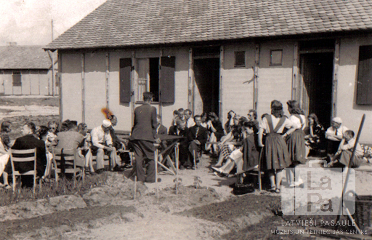 Latviešu bēgļi pulcējas piemiņas aktam pie vienstāvu barakas Zīdlungas bēgļu nometnē Nirnbergā (amerikāņu zonā). Nometne atradās Gebersdorfas rajonā pie Firtes robežas. Piemiņas akts tika veltīts 1941. gada 14. jūnijā Padomju Savienības deportētajiem Latvijas iedzīvotājiem. Cilvēki sēž uz krēsliem, viens vīrietis un divas sieviets stāv kājās. Barakas divas ieejas durvis ir atvērtas. Fonā kreisajā pusē aiz ēkas ir cita vienstāvu baraka.
