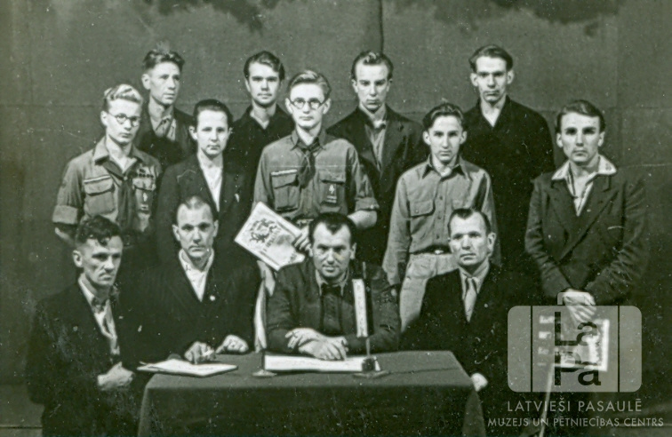 Igauņu un latviešu "ping-pong” sacensības Mercfeldas nometnē (amerikāņu zonā). Priekšā četri vīrieši sēž pie galda iekštelpās. Aizmugurē stāv jaunekļi divās rindās. Divi jaunieši rokās tur dokumentus.