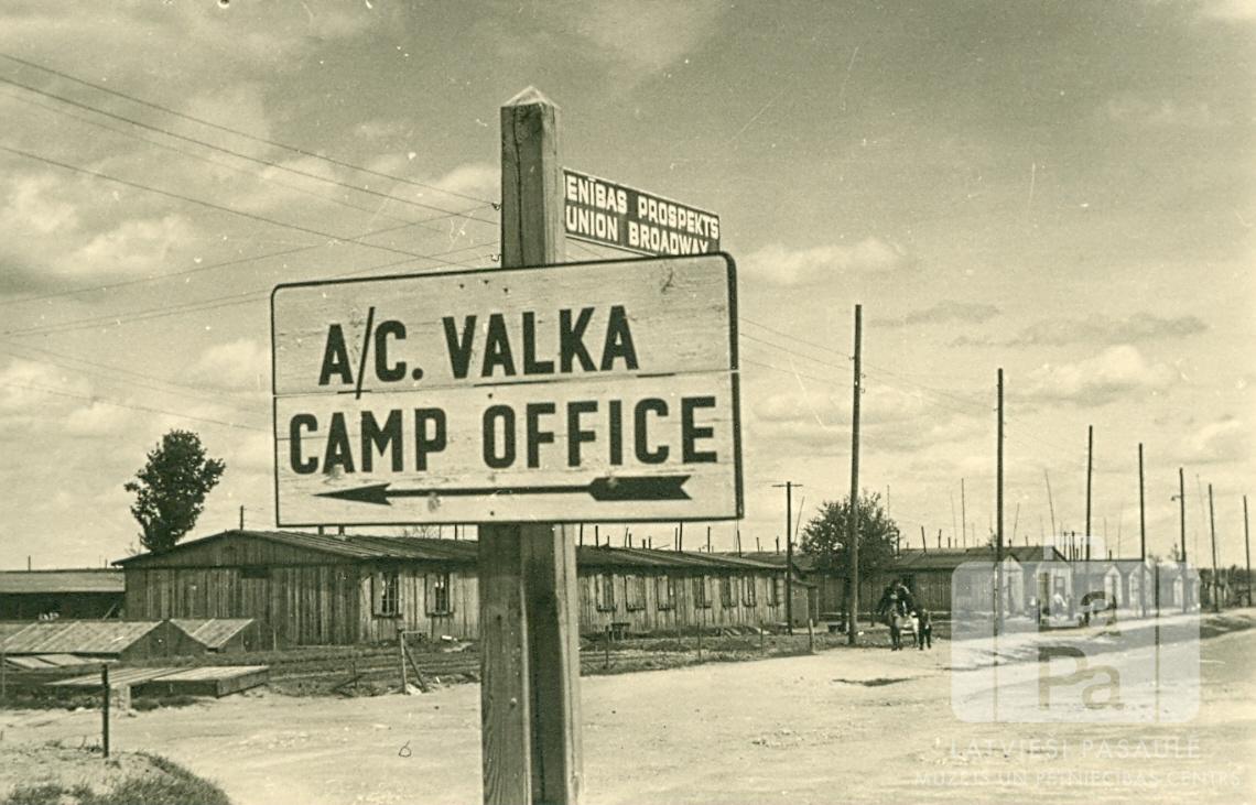 Zīme Valkas nometnē Nirnbergā (amerikāņu zonā) 1947. gada vasarā. Zīme atradās pie nometnes vārtiem. Uz zīmes rakstīts: "A/C. VALKA / CAMP OFFICE". Uz staba otrajā pusē ir cita zīme: "VIENĪBAS PROSPEKTS / UNION BROADWAY". Aiz zīmes ir iela un vienstāvu koka baraku rinda. Pa ielu pastaigājas sieviete ar bērnu.