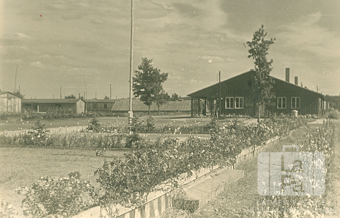 Laukums ar karoga mastu Valkas nometnē Nirnbergā (amerikāņu zonā) 1947. gada vasarā. Fonā ir vienstāvu koka barakas. Laukumā ir sastādītas puķu rindas.