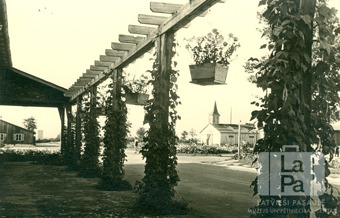 Apstādījumi pie vienstāvu koka barakas Valkas nometnē Nirnbergā (amerikāņu zonā) 1947. gada vasarā. Koka balsti ar vītņaugiem un iekārtiem koka puķu podiem. Caur balstiem labajā pusē fonā ir redzama zema vienstāvu luterāņu koka baznīca ar torni, kas bija uzbūvēta vienā no augsto griestu barakām.