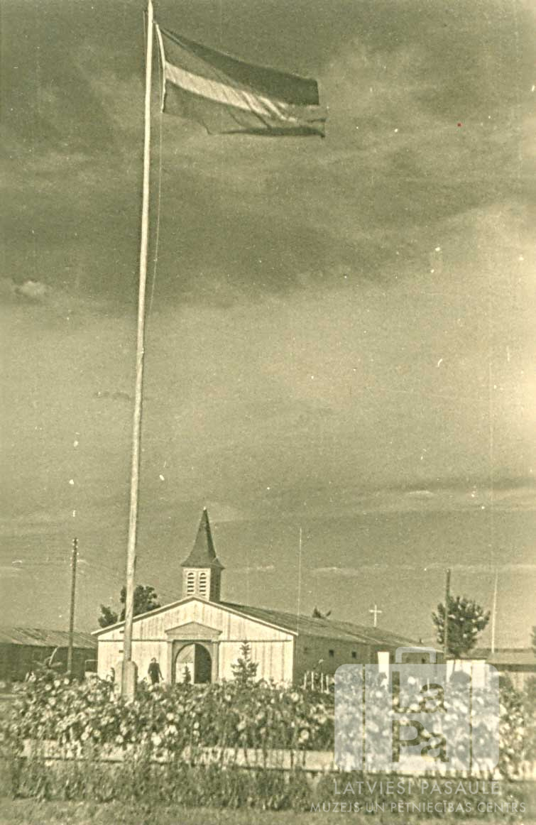 Latvijas karogs mastā Valkas nometnē Nirnbergā (amerikāņu zonā) 1947. gada vasarā. Priekšplānā ir ziedošu puķu rinda. Fonā aiz masta ir redzama zema vienstāvu luterāņu koka baznīca ar torni, kas bija uzbūvēta vienā no augsto griestu barakām.