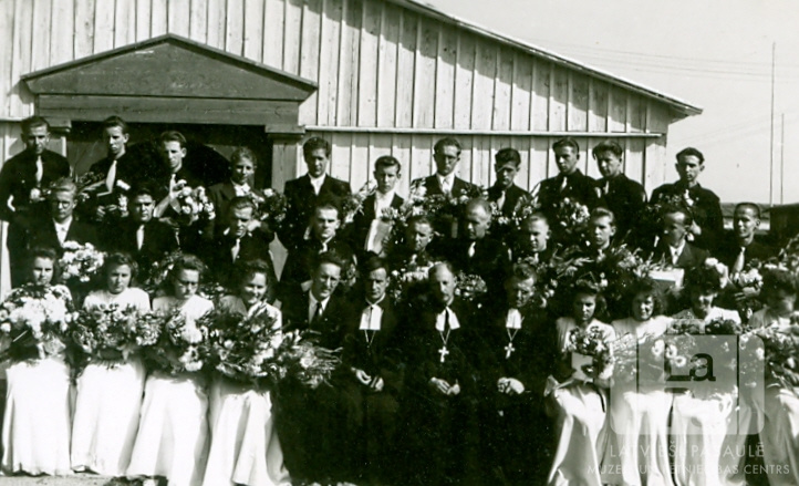 Mācītāji un iesvētītie jaunieši koka baznīcas priekšā Valkas nometnē Nirnbergā (amerikāņu zonā). Jaunietes ir gaišās kleitās, puiši uzvalkos. Pirmās rindas vidū sēž mācītāji amata tērpos. Jauniešiem rokās ir ziedi.