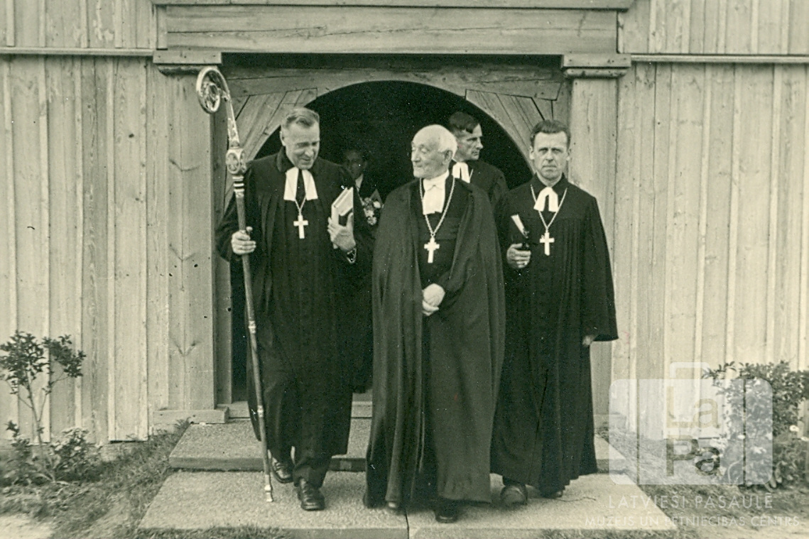 Arhibīskaps un mācītāji pie koka baznīcas ieejas Valkas nometnē Nirnbergā (amerikāņu zonā) 1947. gada vasarā. Priekšplānā ir četri vīrieši mācītāju amata tērpos. Viens vīrietis nes scepteri. Priekšā, otrais no kreisās: Teodors Grīnbergs (arhibīskaps).