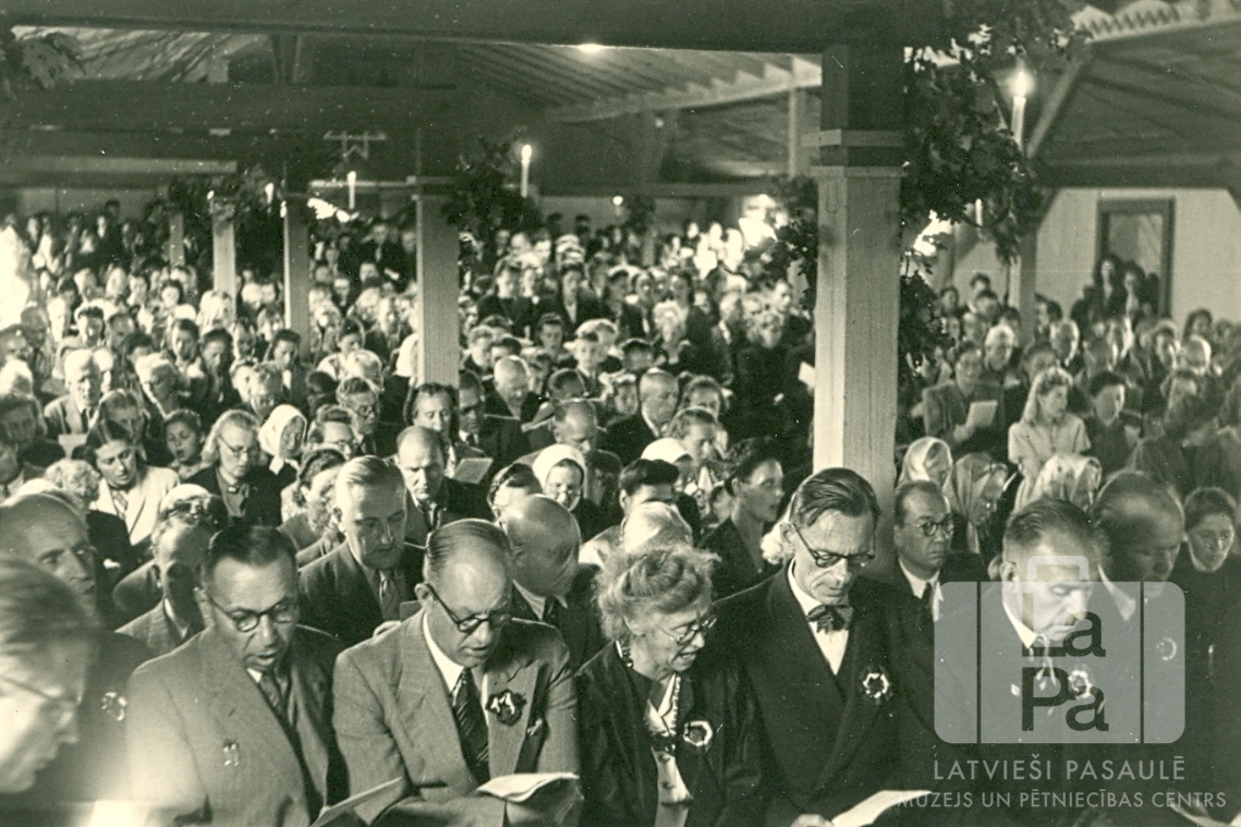 Baznīcas apmeklētāju rindas arhibīskapa viesošanās laikā Valkas nometnē Nirnbergā (amerikāņu zonā) 1947. gada vasarā. Ļaudis, sasēduši koka solos, dzied no nelielām brošūrām. Starp sēdētājiem ir redzamas zemās koka ēkas kolonnas un sijas.