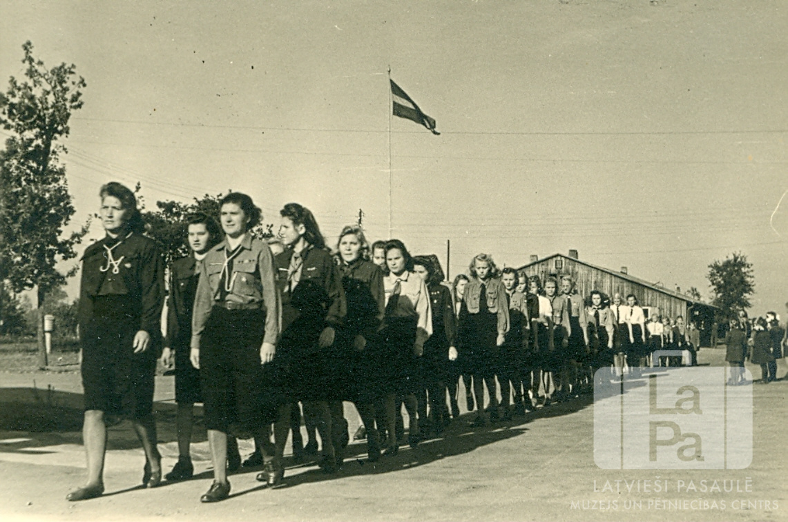 Skrundas 54. gaidu vienības lielgaidas soļo uz savu mītni Valkas nometnē Nirnbergā (amerikāņu zonā) 1948. gada vasarā pēc Latvijas karoga sveikšanas nometnes laukumā. Karoga pacelšana bija tradīcija, ko katru svētdienu izpildīja Skrundas 19. skautu vienība un Skrundas 54. gaidu vienība. Jaunietes formastērpos soļo rindās pa divi. Fonā plīvo Latvijas karogs.