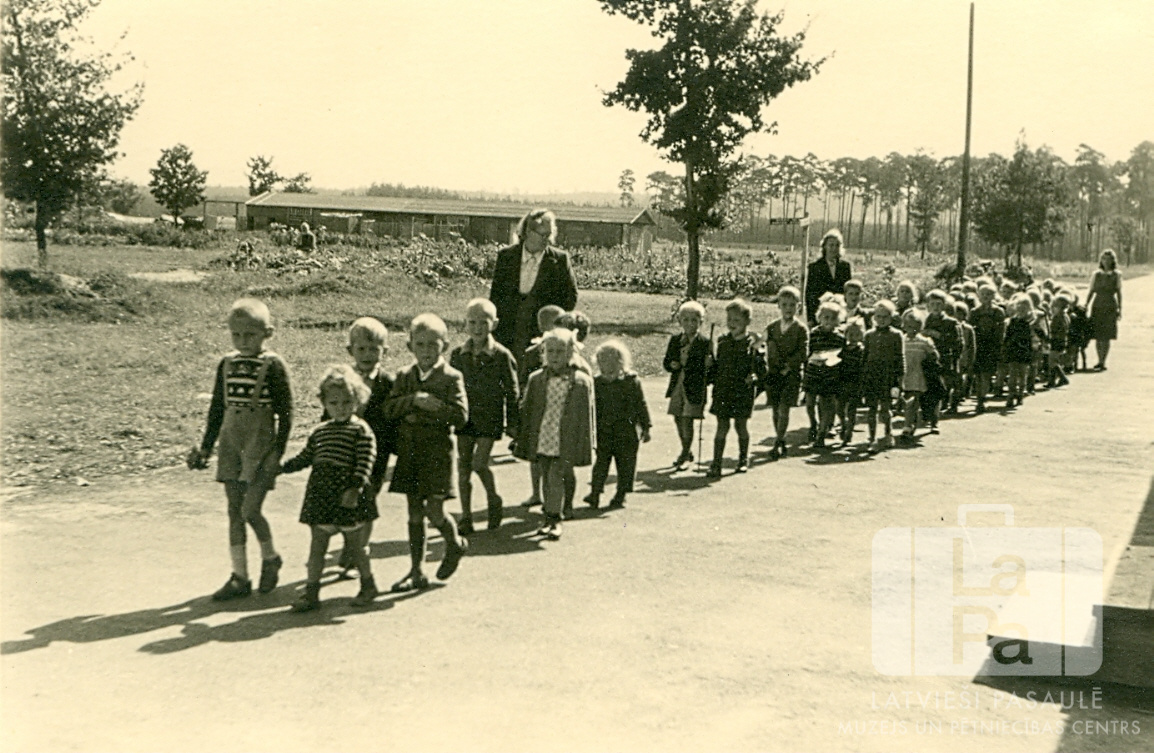 Bērnudārza bērni pastaigājas pa ielu Valkas nometnē Nirnbergā (amerikāņu zonā). Bērni iet garā kolonnā pāros pa divi, viņus pavada trīs sievietes. Fonā ir vienstāvu koka baraka.