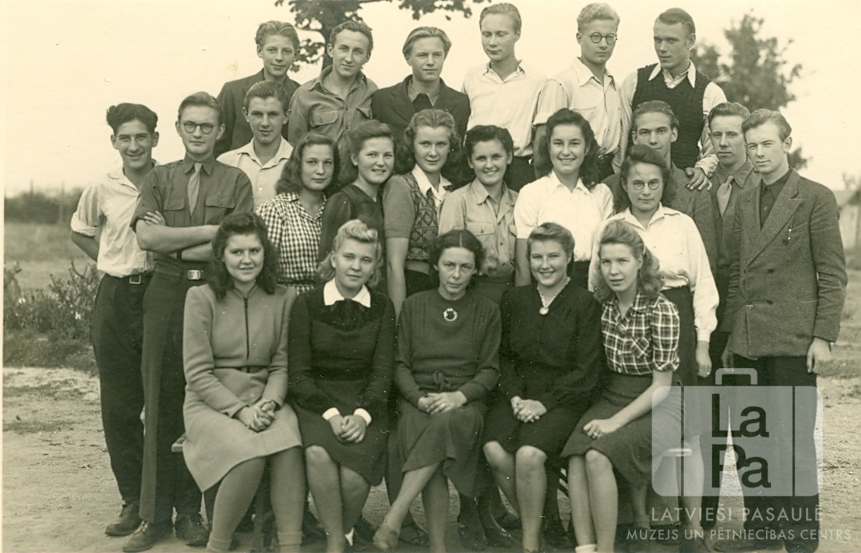 Ata Kronvalda ģimnāzijas 2. klases audzēkņi Valkas nometnē Nirnbergā (amerikāņu zonā). Jaunieši trīs rindās, pirmā rinda sēž uz krēsliem.