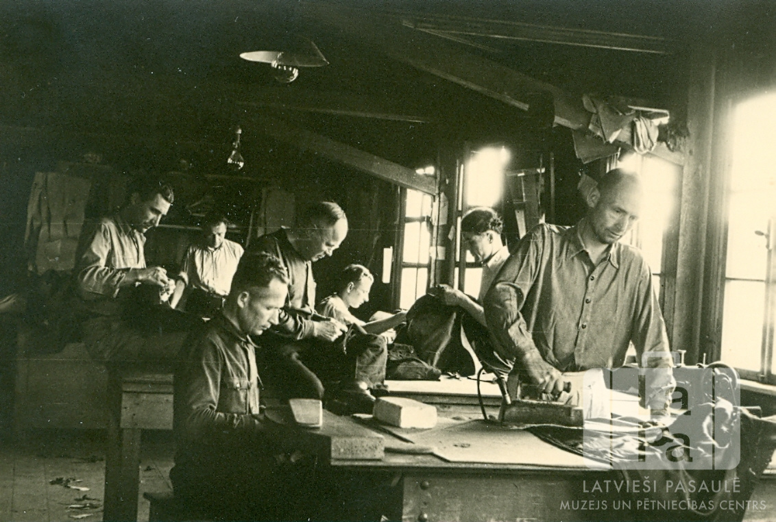 Skroderi pāršuj saziedotās drēbes Valkas nometnē Nirnbergā (amerikāņu zonā) 1946.–1947. gadā. Septiņi vīrieši koka darbnīcā, priekšplānā labajā pusē vīrietis gludina drēbes.