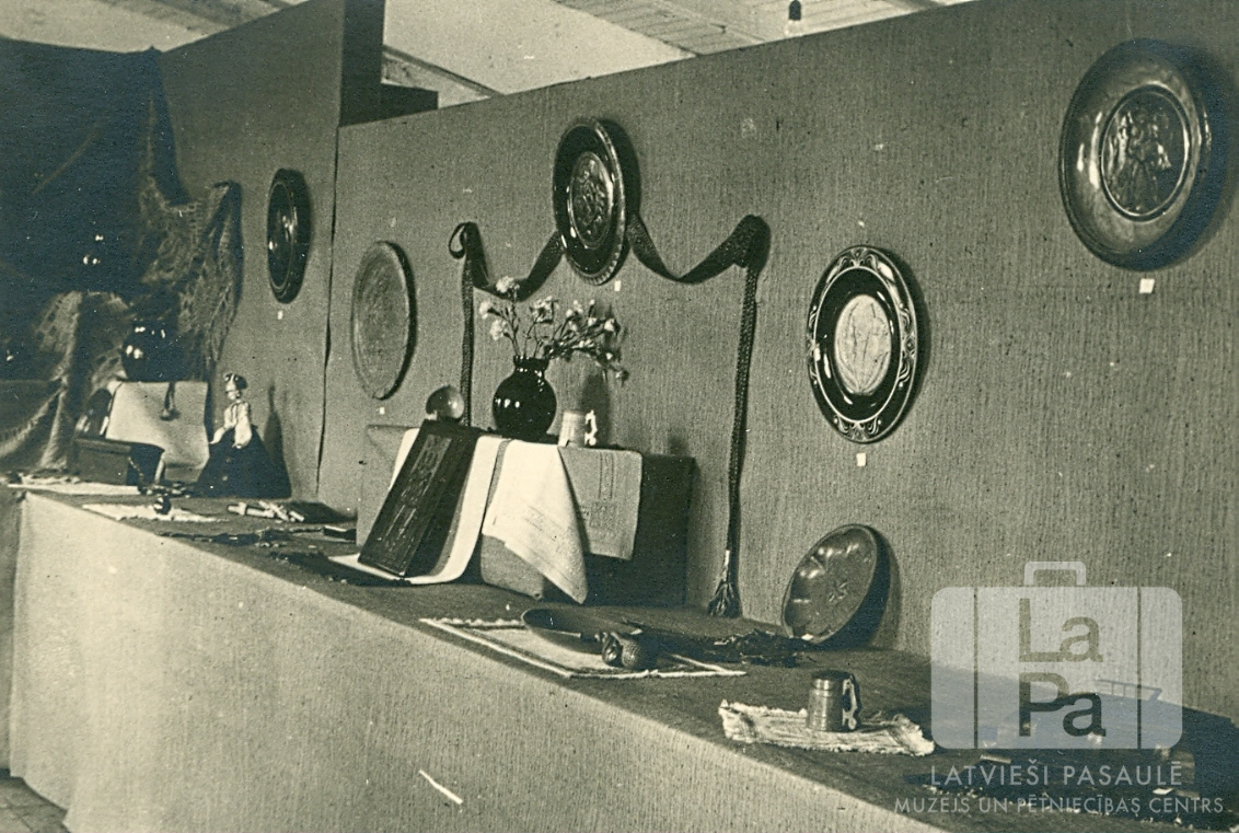 Daiļamatnieku darbu izstāde Dziesmu dienās Fišbahas nometnē (amerikāņu zonā). Uz galda un sienas ir izstādīti dažādi daiļamatniecības izstrādājumi, starp kuriem ir šķīvji, austa josta, krūze, vāze un lelle tautastērpā.