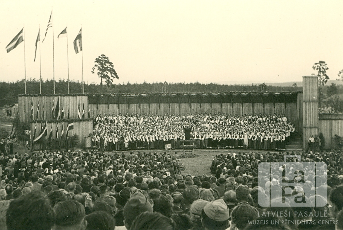 Dziesmu dienas estrāde Fišbahas nometnē (amerikāņu zonā). Dziesmu diena notika pirmo vispārīgo latviešu dziesmu svētku 75 gadu atcerei. Estrādē dzied koris, tā priekšā uz paaugstinājuma stāv diriģents. Estrādes kreisajā pusē ir vairākas rindas ar karogiem, arī Latvijas karogi. Priekšplānā ir skatītāju muguras.