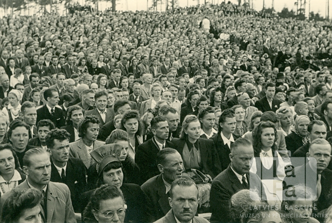 Skatītāji Dziesmu dienā Fišbahas nometnē (amerikāņu zonā). Dziesmu diena notika pirmo vispārīgo latviešu dziesmu svētku 75 gadu atcerei. Liela cilvēku publika daudzās rindās, ar ejām pa vidu.