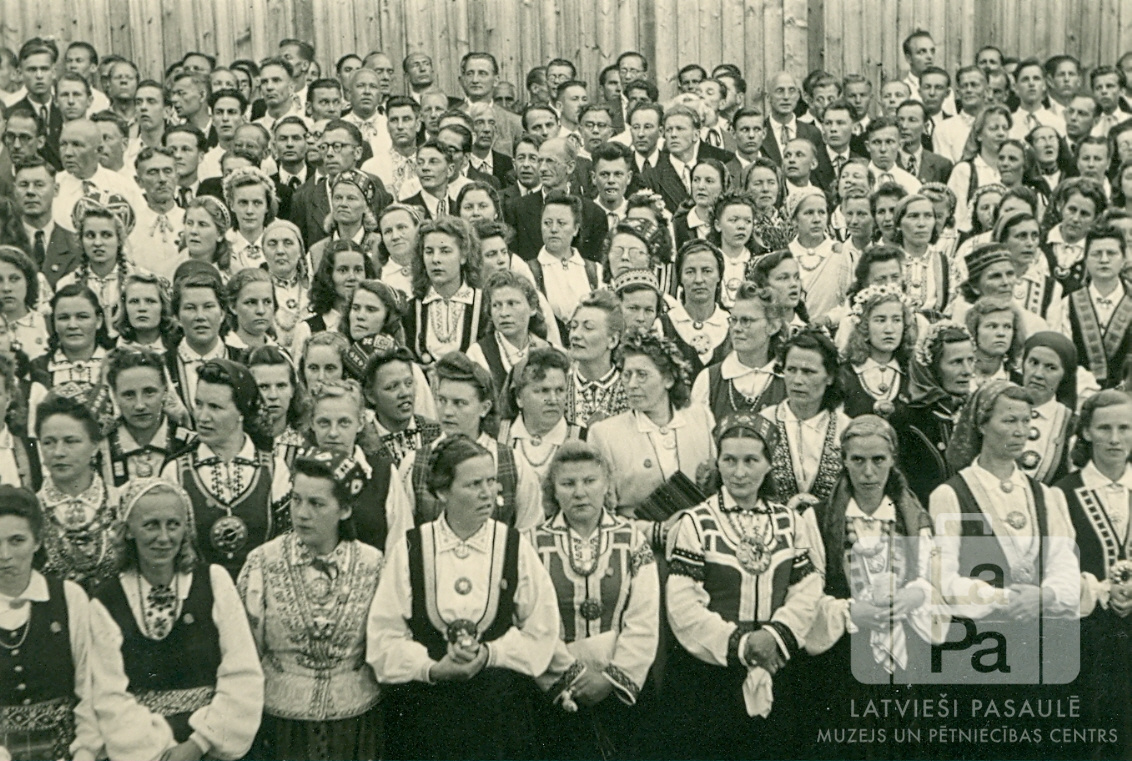 Koristi tautastērpos un uzvalkos stāv vairākās rindās Dziesmu dienā Fišbahas nometnē (amerikāņu zonā). Dziesmu diena notika pirmo vispārīgo latviešu dziesmu svētku 75 gadu atcerei.