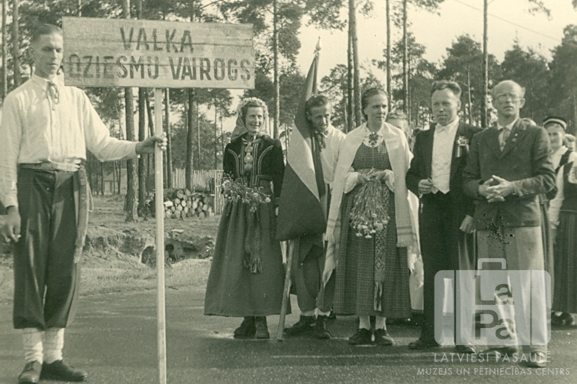 Koris "Dziesmu Vairogs" no Valkas nometnes Nirnbergā Dziesmu dienā Fišbahas nometnē (amerikāņu zonā). Dziesmu diena notika pirmo vispārīgo latviešu dziesmu svētku 75 gadu atcerei. Priekšā kreisajā pusē stāv puisis ar zīmi "VALKA / DZIESMU VAIROGS". Labajā pusē stāv koristi ar diriģentu; viens puisis tur Latvijas karogu. Fonā ir mežs. Priekšplānā, otrais no labās: Arnolds Kalnājs (diriģents, kora vadītājs; Dziesmu dienu virsdiriģents).