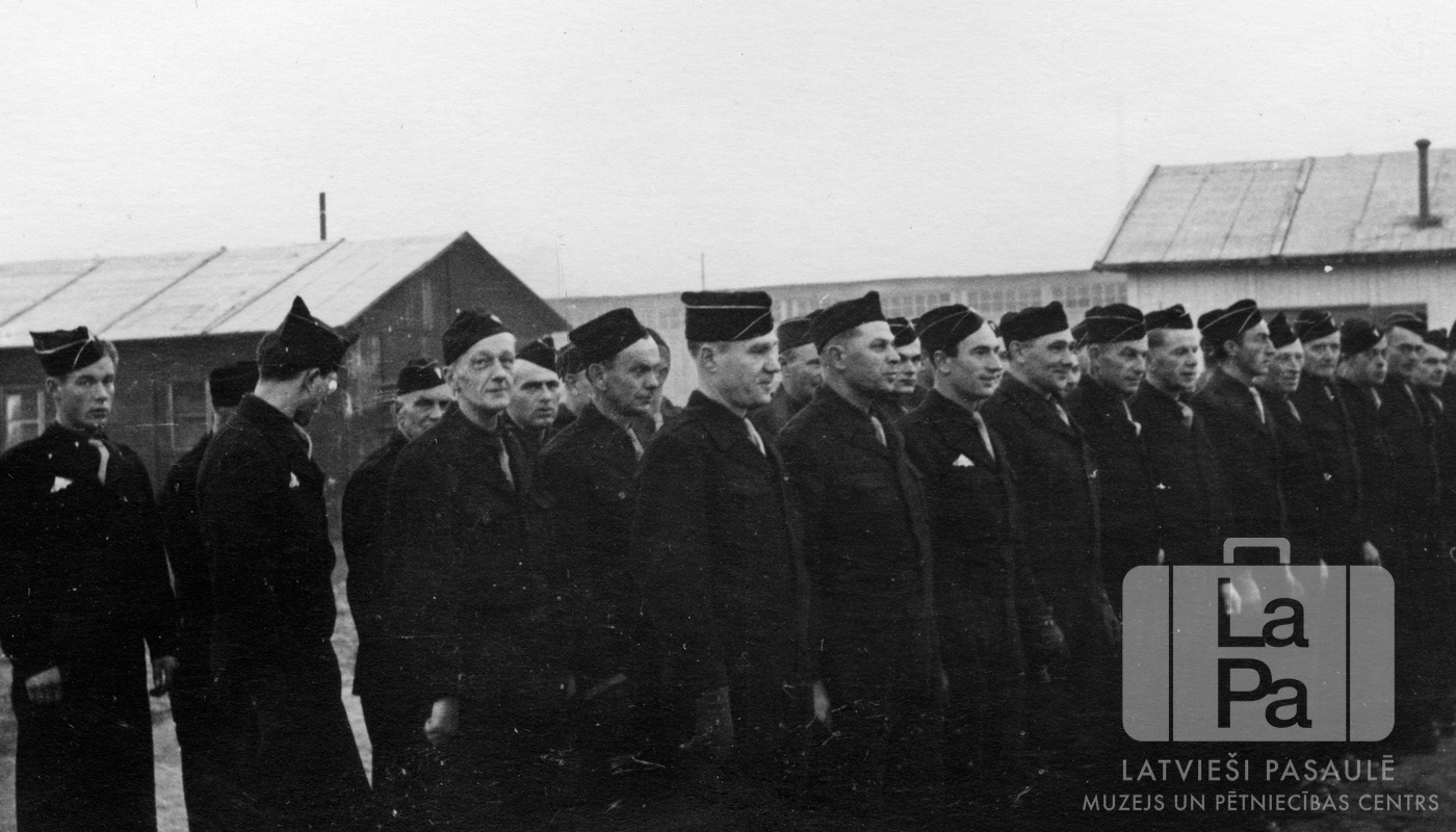 Armijas "melno" vienība stāv ierindā dienesta laikā Eslingenes nometnē (amerikāņu zonā). Fonā ir vienstāvu baraka. Pirmajā rindā, pirmais no kreisās: Jānis A. Lasmanis (vidū).