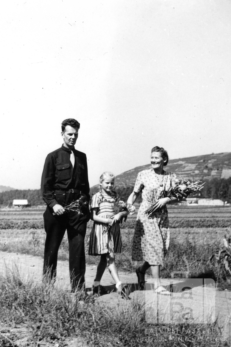 Kampes ģimene ierodas atvadīšanās svinībās Eslingenes apkārtnē (amerikāņu zonā). Tēvs, māte un meita ar ziediem rokās dodas pa šauru ceļu. Fonā ir lauks un kalns. No kreisās: Mācītājs Leo Kampe (mācītājs), Ieva Kampe un Lūcija Kampe.