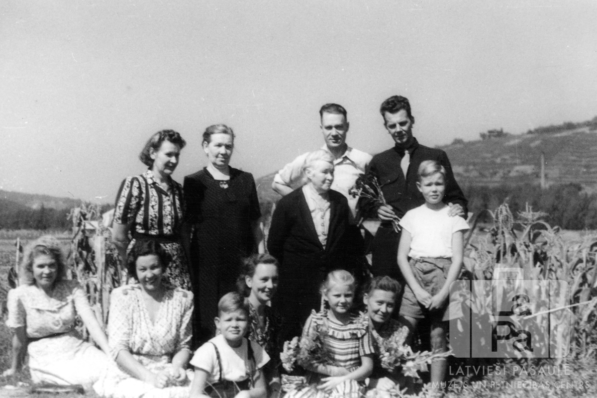 Kampes ģimenes atvadīšanās svinības Eslingenes apkārtnē (amerikāņu zonā). Cilvēku grupa trīs rindās; pirmā rinda sēž uz zemes. Fonā ir lauks un kalns. Pirmajā rindā, no kreisās: nezināms, Zinaīda Lasmanis, Ojārs Lasmanis, nezināms, Ieva Kampe (ar ziediem) un Lūcija Kampe (ar ziediem). Otrajā rindā, no kreisās: trešā Emma Nikiforova un ceturtā Raimonds Lasmanis. Trešajā rindā, no kreisās Jānis Lasmanis un mācītājs Leo Kampe (mācītājs, ar ziediem).