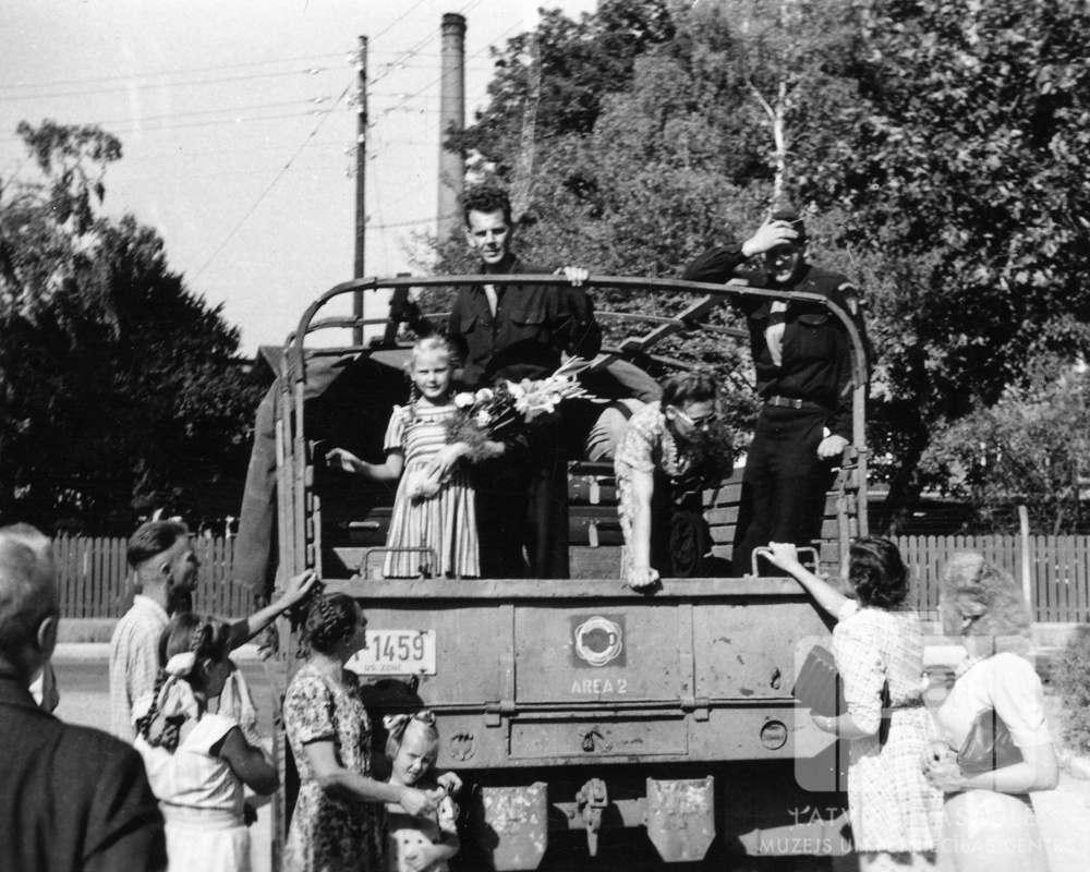 Atvadīšanās no mācītāja Leo Kampes ģimenes Eslingenē (amerikāņu zonā), tai dodoties uz Brēmerhāfeni un no turienes izceļojot uz Austrāliju. Cilvēki kravas mašīnas aizmugurē stāv un atvadās no pavadītājiem; vienai meitenei un sievietei rokās ir ziedi. Priekšā pie automašīnas stāv pavadītāji. Kravas mašīnā, no kreisās: pirmā Ieva Kampe (bērnībā, ar ziediem), otrā Leo Kampe (mācītājs) un trešā Lūcija Kampe (ar ziediem un brillēm).