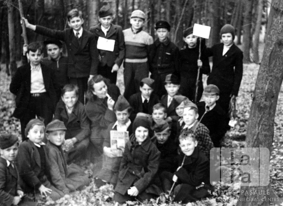 Skauti no Eslingenes nometnes (amerikāņu zonā) sirojuma laikā mežā. Sirojumā tika gatavotas koka svilpes. Zēni sēž un stāv vairākās rindās, viņu vidū sēž sieviete. Dažiem zēniem rokās ir nūjas, divi citi zēni tur gaišas papīra lapas.