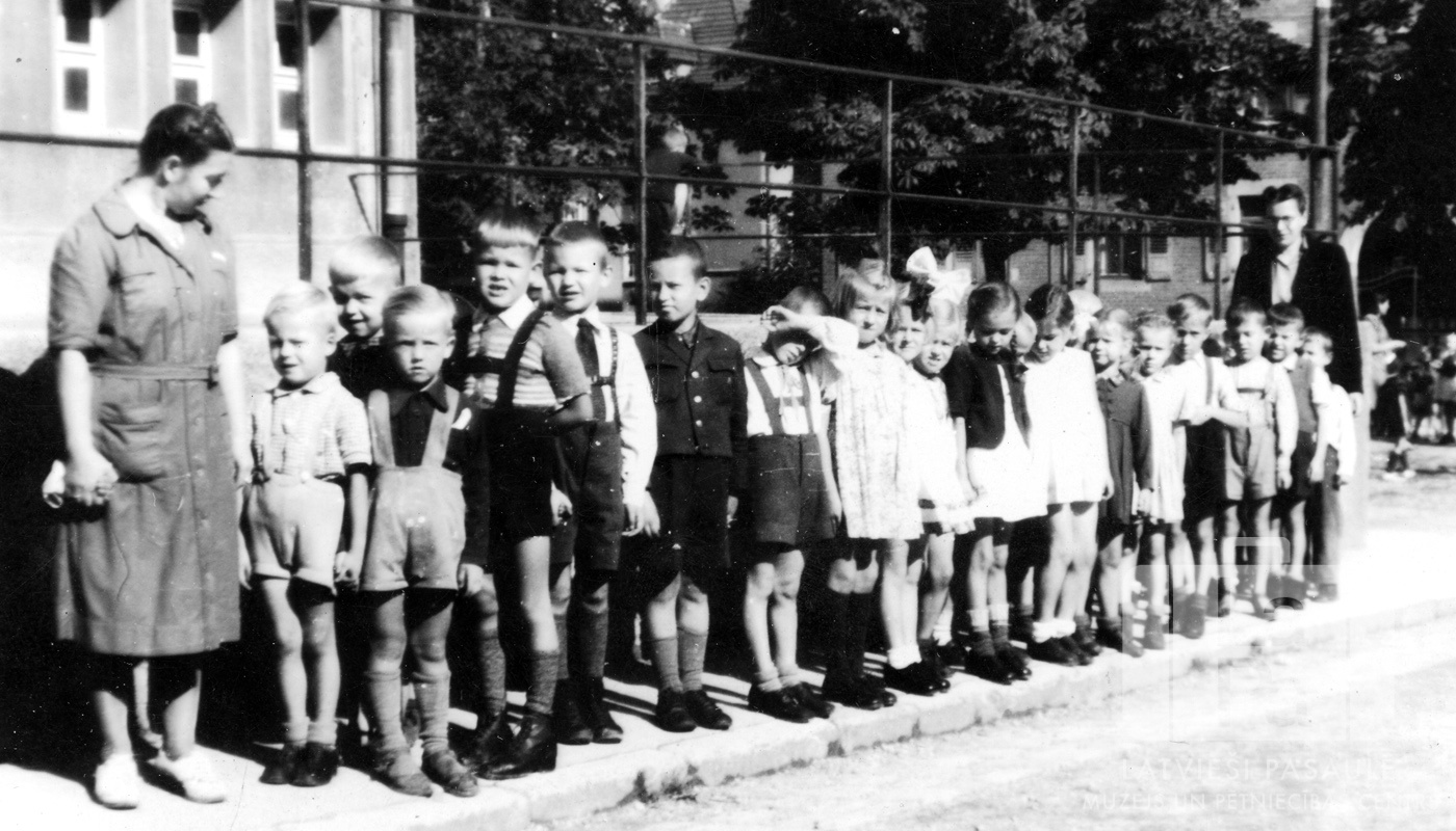 Pamatskolas klase Eslingenes nometnē (amerikāņu zonā). Mazi bērni stāv rindā uz ietves, katrā galā stāv sieviete. Fonā ir dzelzs margas un mūra ēka. Piektais no kreisās: Ojārs Lasmanis.