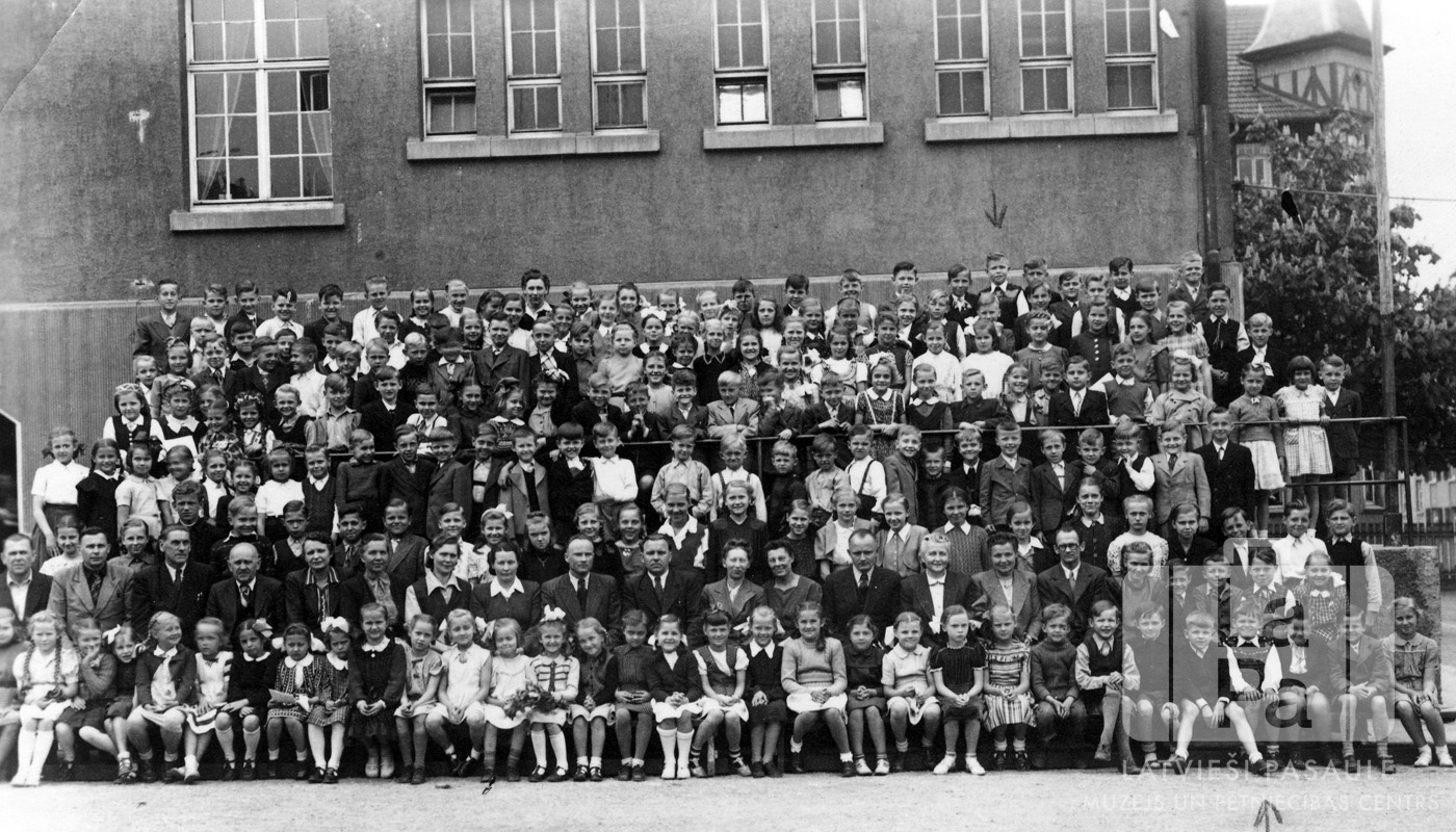 Latviešu skolas skolēni un skolotāji Eslingenes nometnē (amerikāņu zonā). Liela cilvēku grupa vairākās rindās augstas mūra ēkas priekšā. Redzami ēkas logi. Fonā labajā pusē, aiz ēkas aug ziedošs kastaņkoks, un ir redzama vēl viena ēka. Pirmajā rindā, ceturtais no labās: Ojārs Lasmanis (virs bultas). Pēdējā rindā, ceturtais no labās: Raimonds Lasmanis (zem bultas).