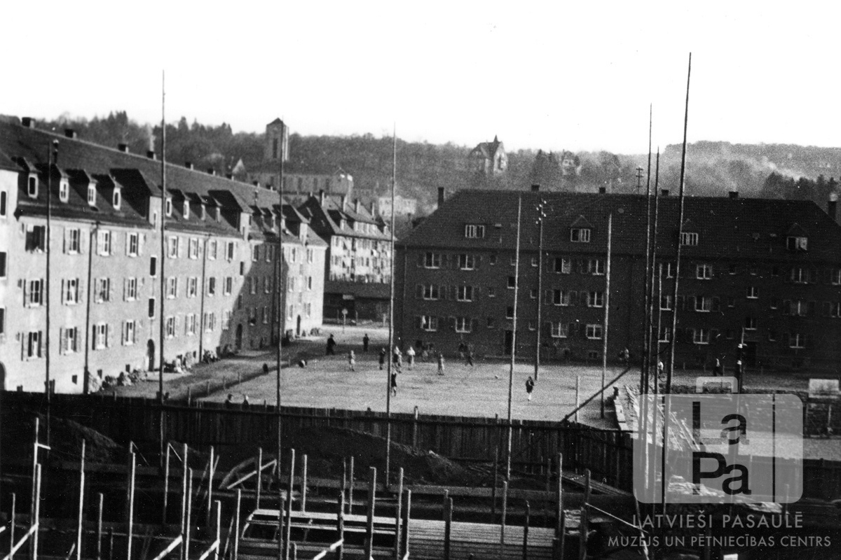 Vairākstāvu dzīvojamās ēkas latviešiem, poļiem un citu tautu bēgļiem Eslingenes nometnē (amerikāņu zonā). Starp ēkām ir sporta laukums ar cilvēkiem. Priekšplānā ir koka žogs ar augstiem mastiem. Fonā ir ēkām un mežiem klāts kalns.