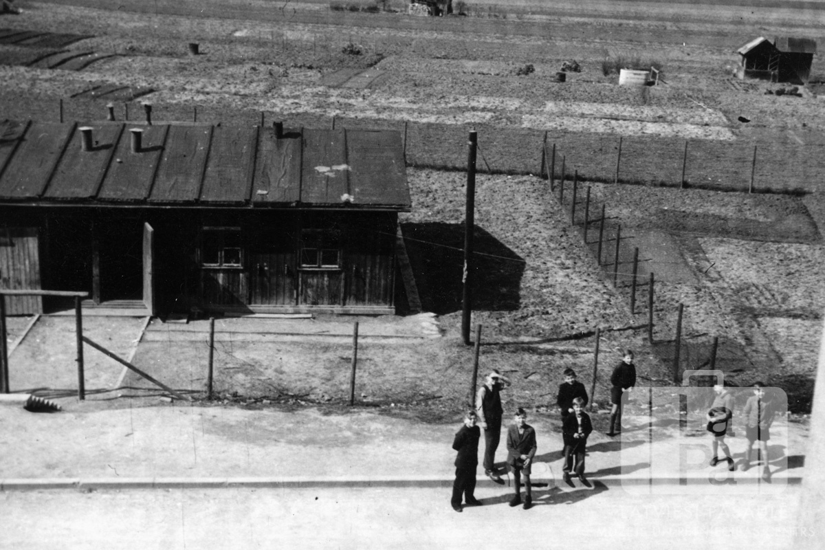 Zēni stāv uz ietves pie iežogotas vienstāvu koka ēkas Eslingenes nometnē (amerikāņu zonā). Aiz ēkas žogs beidzas, tālāk turpinās lauks, ar, iespējams, nelielu dārzu un mazu būdu labajā pusē. Zēnu grupā ir redzami: Raimonds Lasmanis, Ojārs Lasmanis un Rolands Karšs. Skats no augšas.