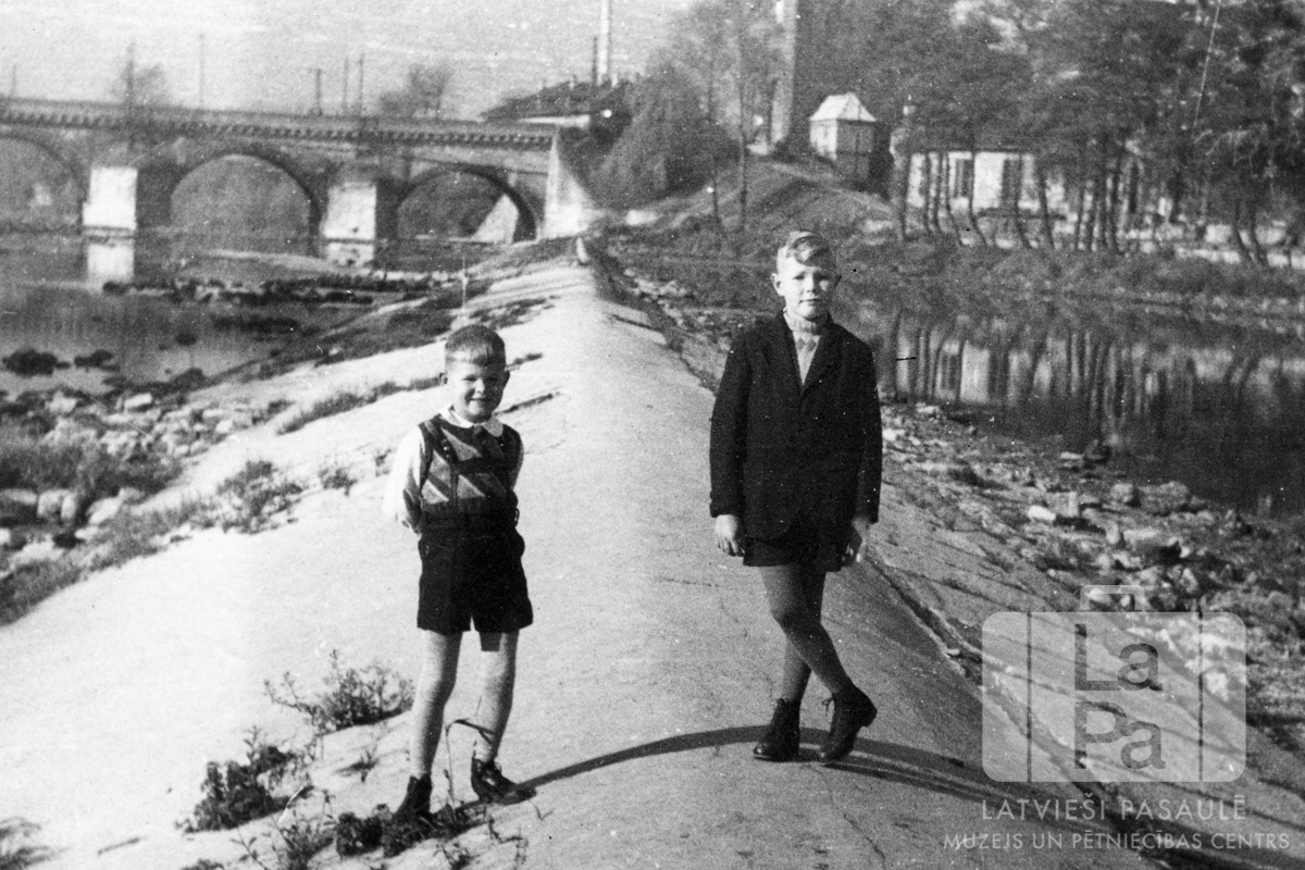 Divi brāļi uz Nekāras upes ūdens novirzīšanas dambja Eslingenē (amerikāņu zonā). Fonā dambja galā ir tilts pāri upei un ēkas upes krastā. No kreisās: Ojārs Lasmanis un Raimonds Lasmanis.