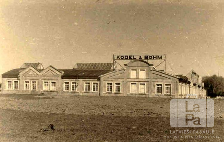 Liela vienstāvu mūra ēka bijušās Lielvācijas "Kodel & Böhm" lauksaimniecības mašīnu fabrikas kompleksā, kurā tika iekārtota Lauingenes nometne (amerikāņu zonā). Komplekss bija karā izpostīts. Uz ēkas jumta labajā pusē ir fabrikas nosaukums. Priekšplānā ir lauks.
