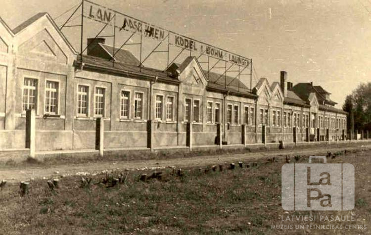 Vienstāvu mūra ēka bijušās Lielvācijas "Kodel & Böhm" lauksaimniecības mašīnu fabrikas kompleksā, kurā tika iekārtota Lauingenes nometne (amerikāņu zonā). Komplekss bija karā izpostīts. Uz ēkas jumta ir nosaukums, daļa ir salasāma: "... KODEL & BÖHM LAUINGEN". Priekšplānā ir lauks.