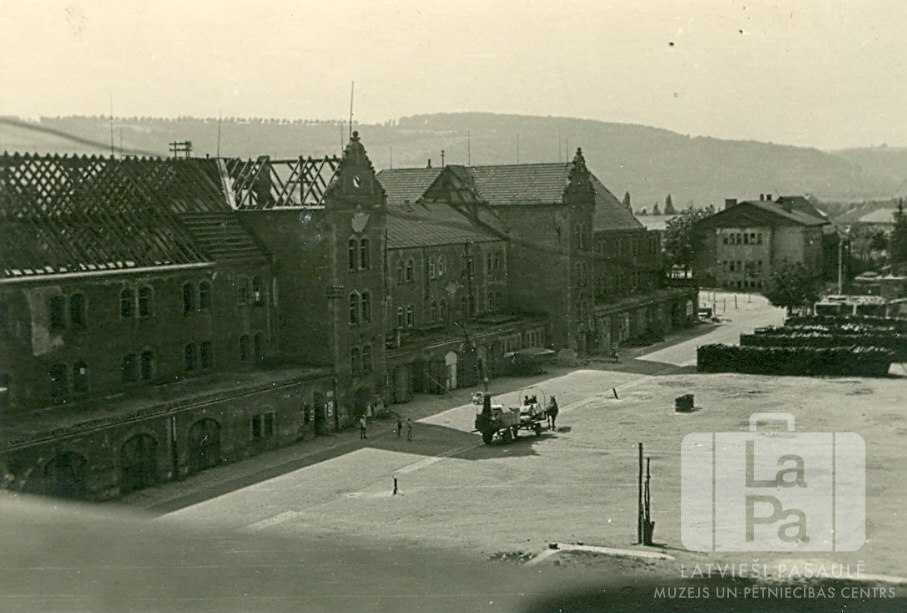 Ēka Nr. 13 Centrālajā nometnē Vircburgā (amerikāņu zonā). Trīsstāvu mūra ēka, kurai ir redzamas jumta spāres vienā pusē. Ēka bija daļēji sabumbota kara laikā. Tai blakus labajā pusē ir laukums. Uz ielas starp laukumu un ēku brauc zirga vilkti rati un pastaigājas cilvēki. Laukumā ir arī vairākas rindas ar, iespējams, sakrautiem baļķiem. Laukums vēlāk tika izbūvēts kā nometnes centrālais laukums. Ēkas galā ir redzamas citas, zemākas mūra ēkas. Fonā ir zems kalns. Skats no augšas.