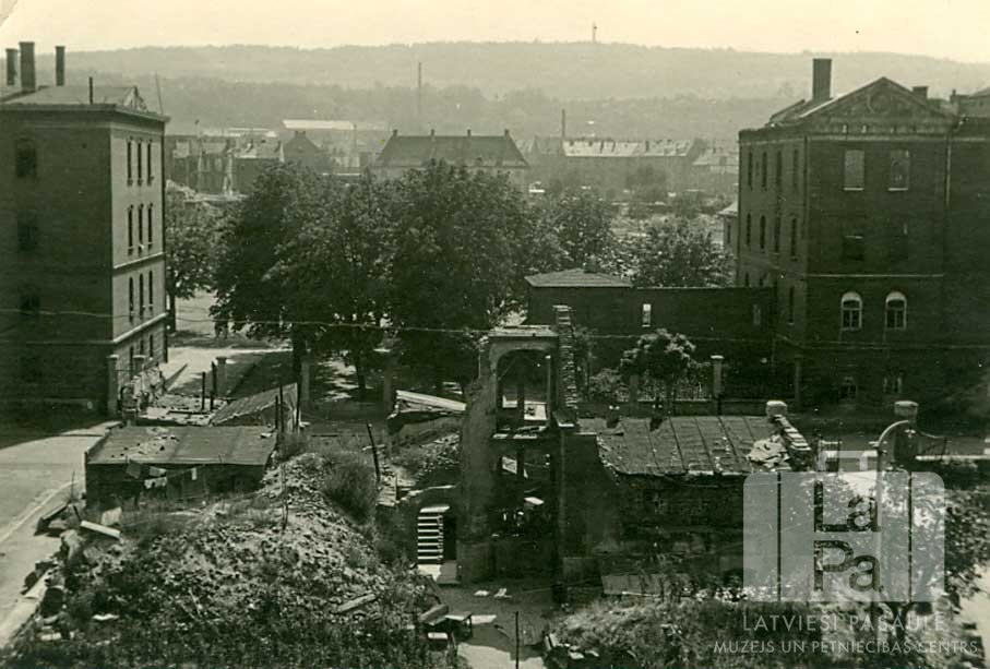 Ēkas Centrālajā nometnē Vircburgā (amerikāņu zonā). Šo nometnes daļu sauca par "Staļingradu". Priekšplānā ir zema, daļēji sagruvusi ēka un izmētāti ķieģeļi. Aiz tās ir divas četrstāvu mūra ēkas ar kokiem apaugušu zonu pa vidu. Tālāk ir redzamas pilsētas citas mūra ēkas. Fonā ir zems kalns.