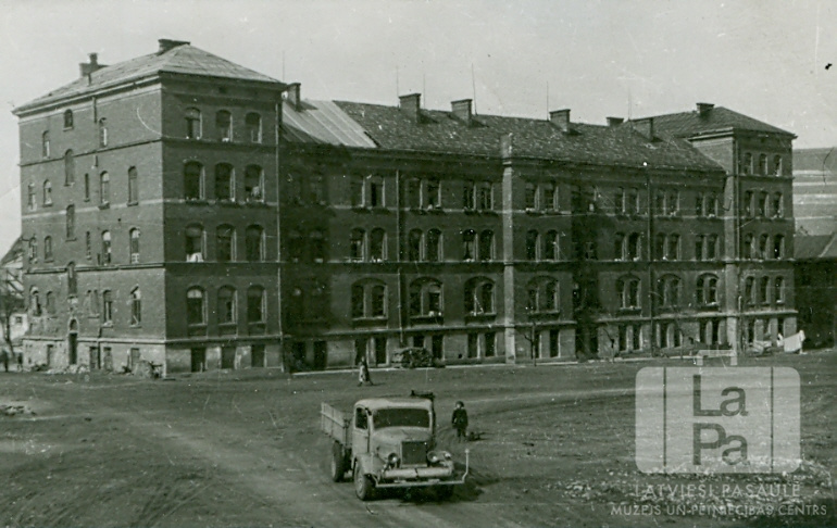 Ēka Nr. 8 Centrālajā nometnē Vircburgā (amerikāņu zonā). Četrstāvu mūra ēkas priekšā ir laukums. Priekšplānā ir smagā kravas mašīna (iespējams, "Citroen" marka). Laukumā pastaigājas divi cilvēki, viens no tiem ir pie mašīnas.