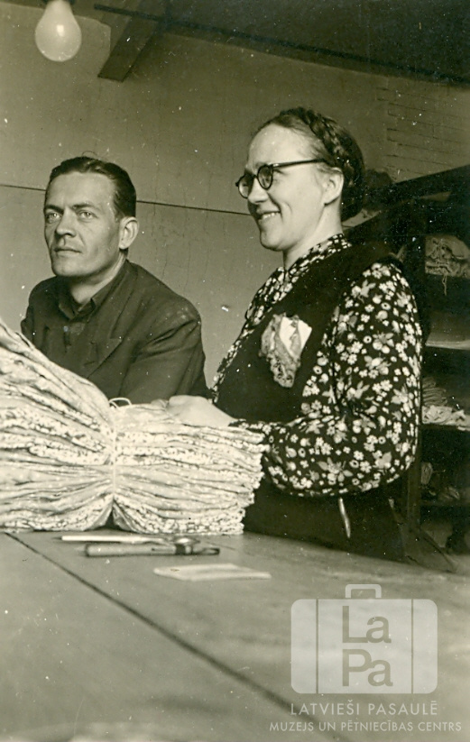 Divi darbinieki lietoto drēbju izdalē Centrālajā nometnē Vircburgā (amerikāņu zonā). Vīrietis un sieviete stāv pie galda, uz kura ir ar auklu aptīts drēbju sainis. Fonā, labajā pusē, ir plaukti ar apģērbu. No kreisās: ? Līdums un V. Eglīte. Par šo gadījumu Raita Brunovska (dz. Eglīte) stāsta: "Vircburgas Centrālā DP nometnē iekārtoja noliktavu, kur glabāja no ASV atsūtītās saziedotās drēbes un izdalīja pēc vajadzības, un vajadzības bija daudz."